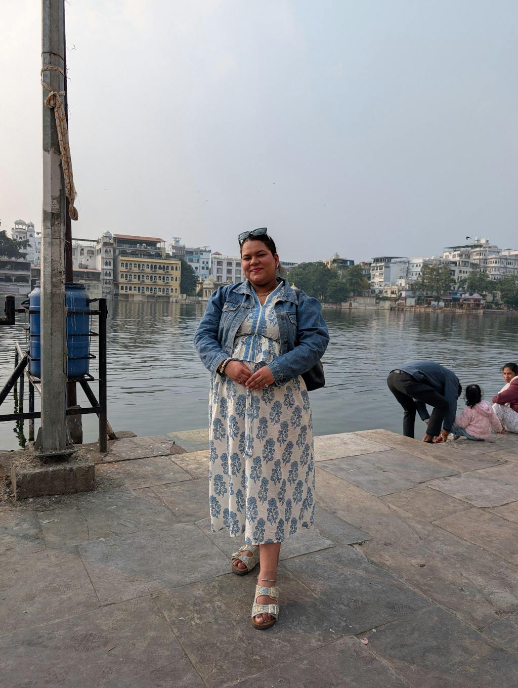 Hand-blocked White & Blue Elasticated Long Dress